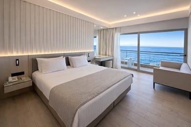 Where luxury meets the horizon—wake up to uninterrupted views of the Aegean Sea and the golden sands of Aquarium Beach from the serenity of your private retreat. Designed for those who seek refined elegance and effortless comfort, our newly renovated Signature Double Room Front Sea View offers a sophisticated setting where every detail enhances your stay. From the soft sea breeze on your balcony to the plush comforts within, this is a space crafted for relaxation and indulgence.